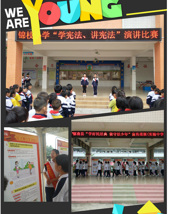 為進(jìn)一步強(qiáng)化師生法治觀念,各校深入探索青少年喜聞樂見的新途徑、新方式,不斷增強(qiáng)憲法等法律學(xué)習(xí)教育的針對和實(shí)效性。都城鎮(zhèn)錦枝小學(xué)開展“學(xué)憲法講憲法”主題演講比賽,充分調(diào)動學(xué)生參講憲法活動的積極性;連灘鎮(zhèn)初級中學(xué)邀請司法所工作人員開展憲法進(jìn)校園活動,通過互動的形式向師生們解讀憲法知識內(nèi)容,并向?qū)W生派發(fā)憲法小冊子以便加強(qiáng)學(xué)習(xí);南江口中心小學(xué)利用升旗儀式強(qiáng)化憲法教育,法治副校長通過互動教學(xué)的方式,播撒法治信仰的種子,讓學(xué)生認(rèn)識了解憲法、尊崇維護(hù)憲法;西江實(shí)驗(yàn)中學(xué)開展《民法典》宣傳展板校內(nèi)巡展活動,便于在校的2000多名學(xué)生利用課外時(shí)間學(xué)習(xí)法律知識。