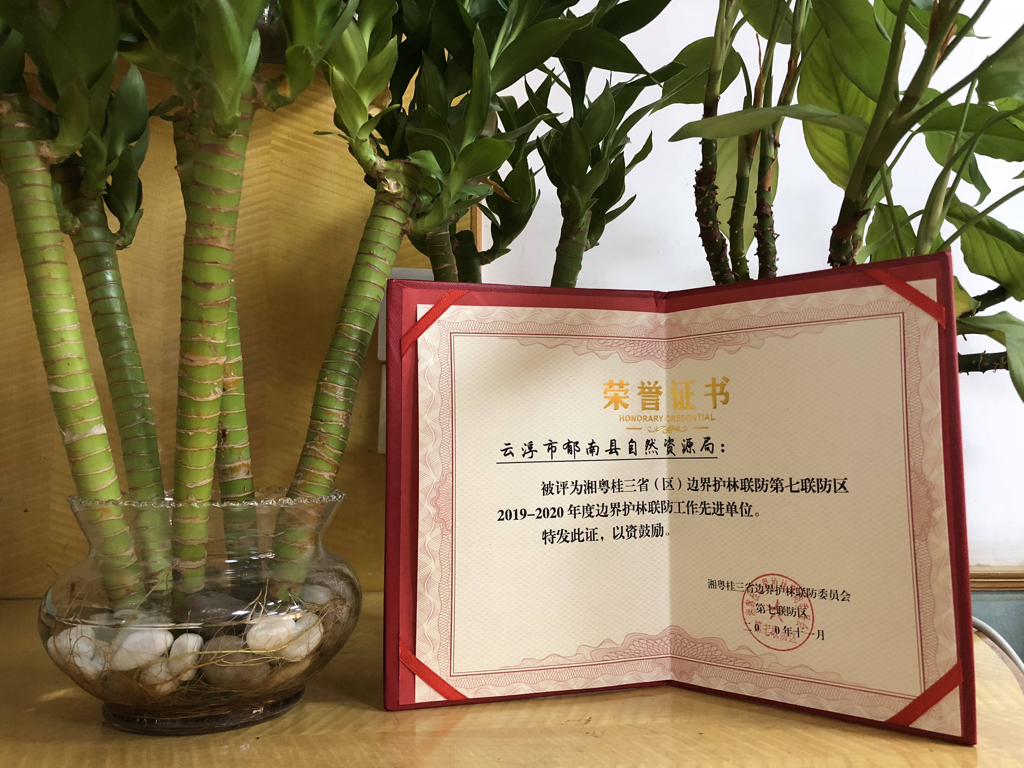 ▲湘粵桂三省(區(qū))邊界護林聯防第七聯防區(qū)2019-2020年度邊界護林聯防工作先進單位榮譽證書