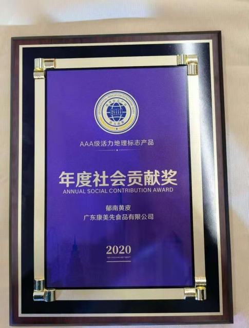 2020年11月在粵港澳大灣區(qū)核心地標(biāo)——“廣州塔”舉行的“中國地理標(biāo)志產(chǎn)品活力指數(shù)頒獎(jiǎng)盛典”上,經(jīng)中國地理標(biāo)志產(chǎn)品活力指數(shù)發(fā)布評審活動(dòng)組委會(huì)、廣東省農(nóng)村電子商務(wù)協(xié)會(huì)評定,廣東康美先食品有限公司生產(chǎn)的無核黃皮餅榮獲年度社會(huì)貢獻(xiàn)獎(jiǎng)。