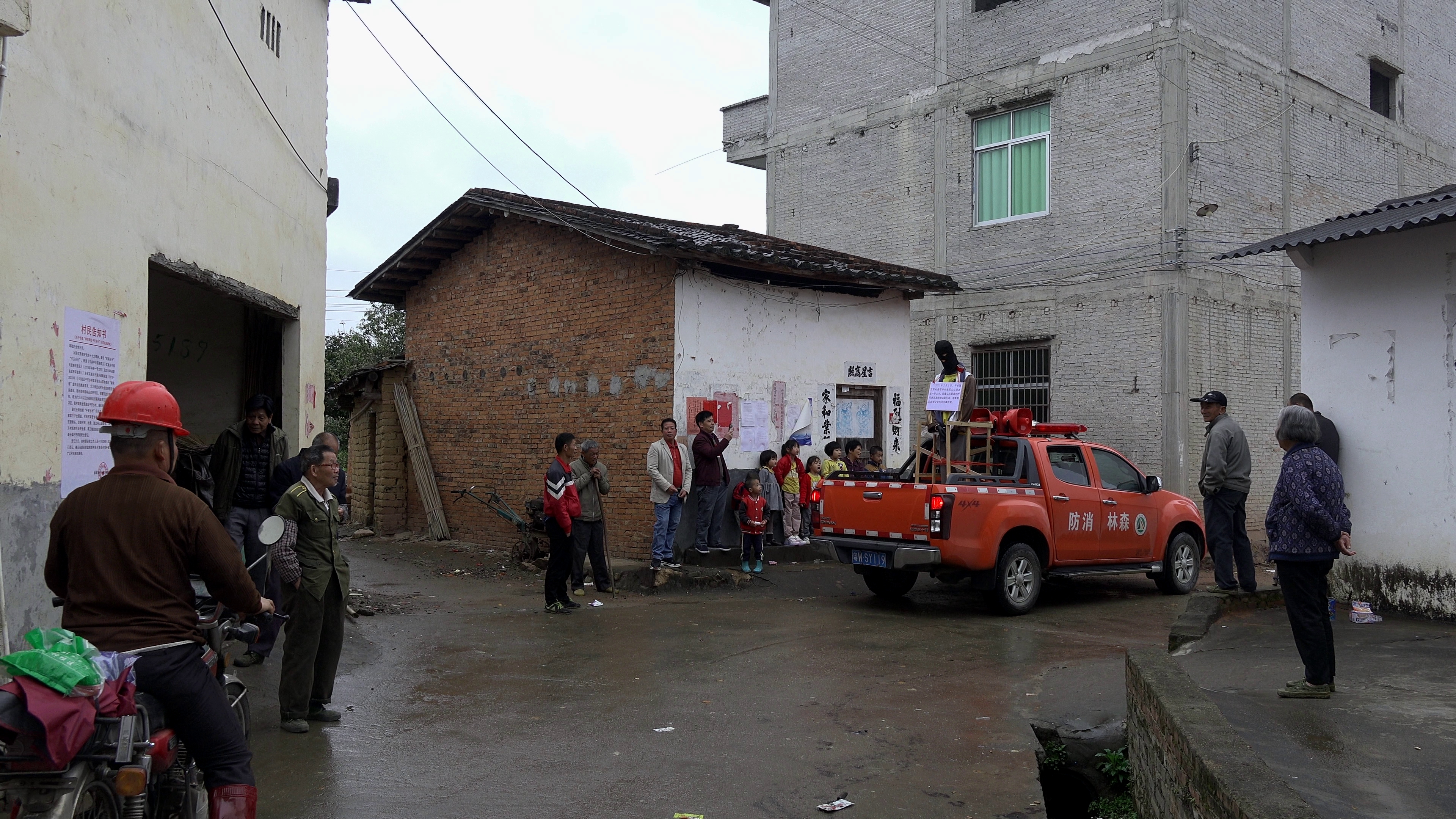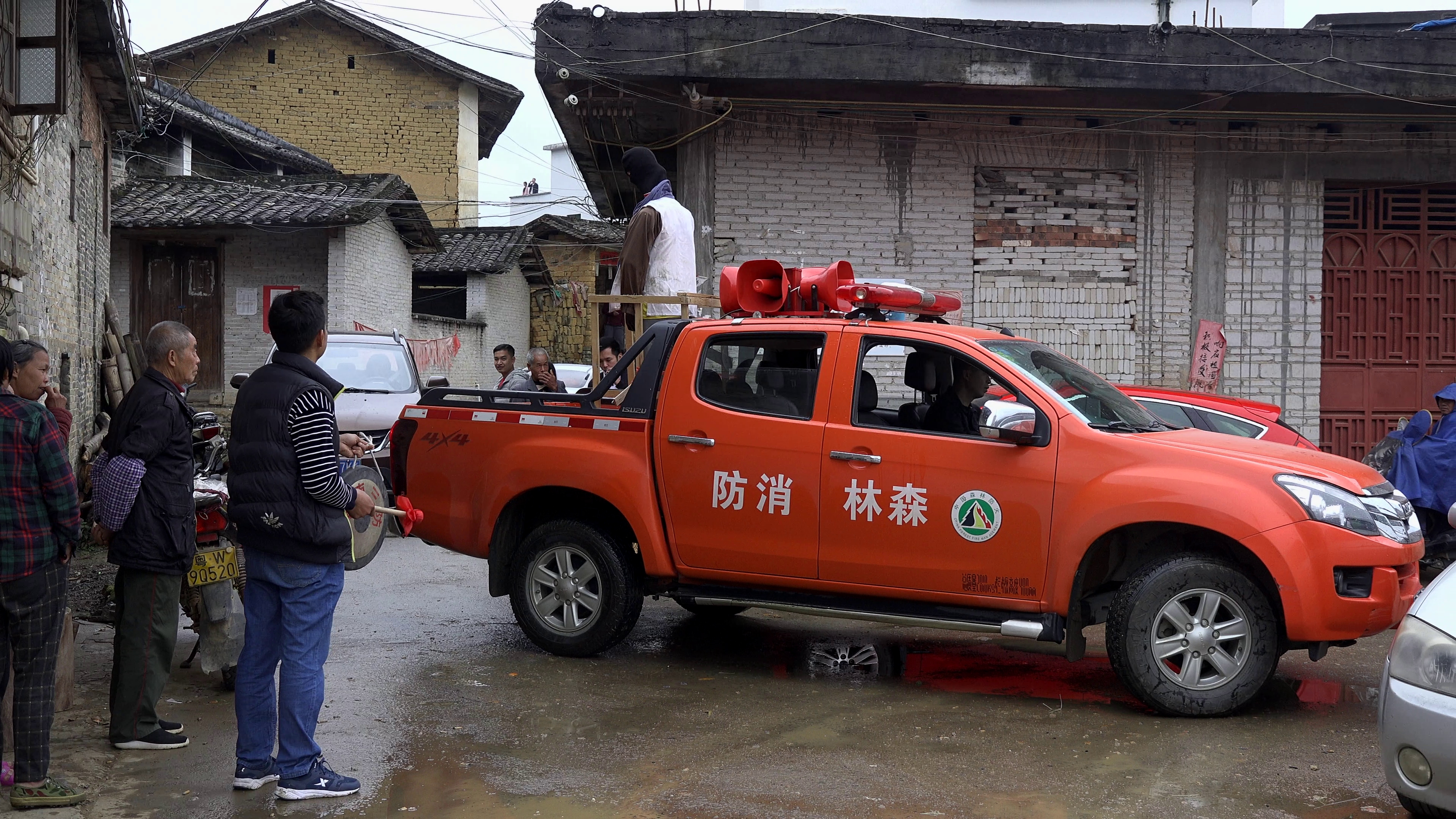 陣陣粵語宣傳語音在村道某處遠遠回響,一輛森林消防車載著一個戴著手銬和寫著典型案例的牌子的模型在鄉(xiāng)鎮(zhèn)開展森林防火工作,所經(jīng)過的村民紛紛被宣傳車和宣傳語音吸引了過來,一旁的小孩子還學著語音說了起來。