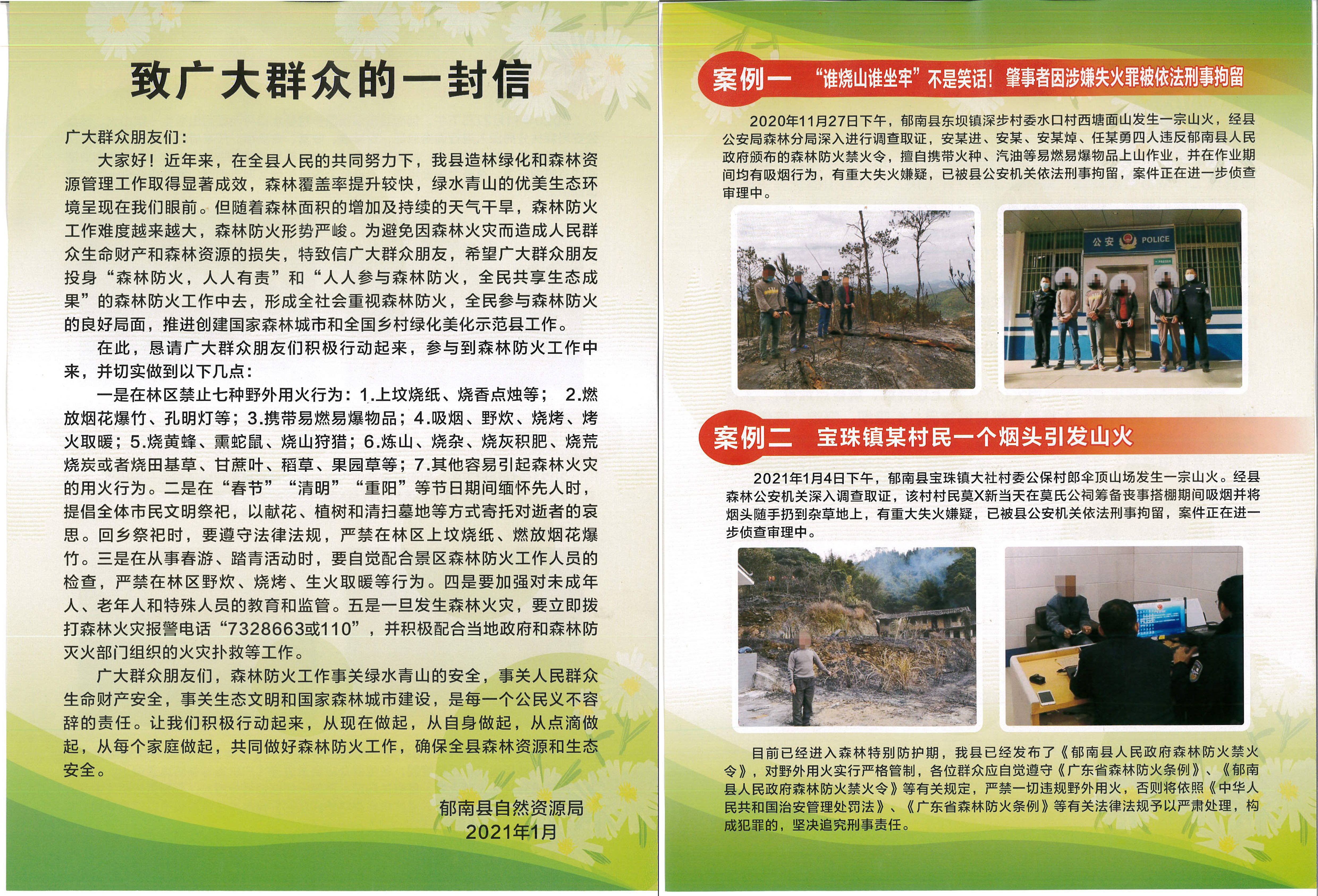 開(kāi)展兩個(gè)宣傳,筑牢兩個(gè)意識(shí)。開(kāi)展正面宣傳,筑牢安全意識(shí)。充分利用宣傳車(chē)、大小喇叭等手段,在各鎮(zhèn)、各村、各主要進(jìn)山路口和臨時(shí)檢查站每天滾動(dòng)播放禁火令。對(duì)全縣241所中小學(xué)、幼兒園開(kāi)展“小手拉大手”活動(dòng),營(yíng)造“一小孩帶全家防火”的濃厚氛圍。專(zhuān)門(mén)印制《致廣大群眾的一封信》《郁南縣文明祭祀倡議書(shū)》《郁南縣人民政府森林防火禁火令》《森林防火宣傳小冊(cè)子》等宣傳資料10萬(wàn)多份派發(fā)到群眾手中,切實(shí)筑牢群眾森防安全意識(shí)。開(kāi)展反面宣傳,筑牢法治意識(shí)。創(chuàng)新宣傳方式,采用森林消防車(chē)載著一個(gè)戴著手銬、寫(xiě)著典型案例的“違法失火假人模型”,循環(huán)播放警示口號(hào),持續(xù)到各鎮(zhèn)村進(jìn)行“現(xiàn)身警示教育”,做到“處理一人、震懾一方、教育一片”,引導(dǎo)群眾破除迷信,文明祭祖,切實(shí)筑牢法治意識(shí)。今年以來(lái),全縣發(fā)現(xiàn)并打擊違規(guī)野外用火行為196起,警示教育179人。