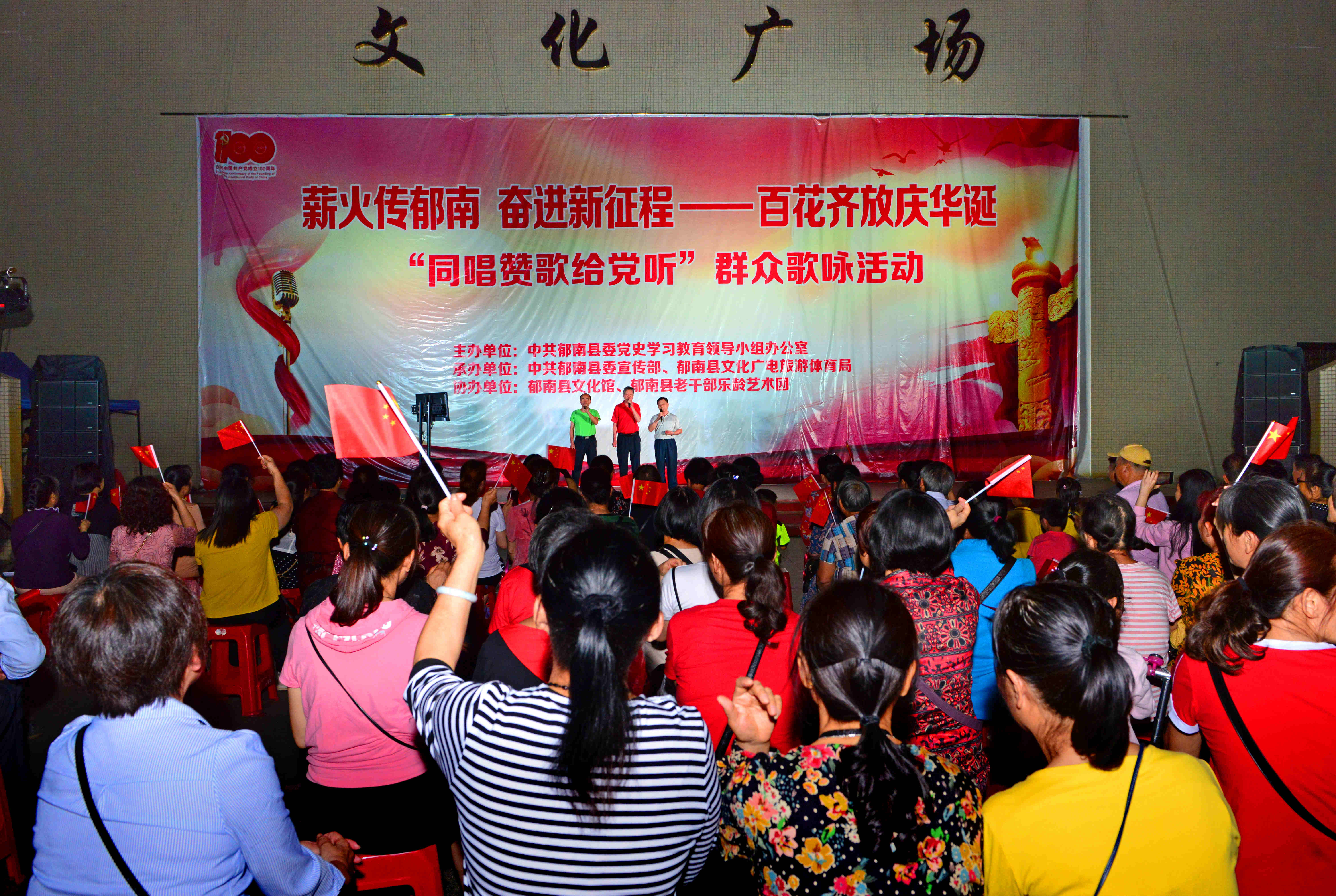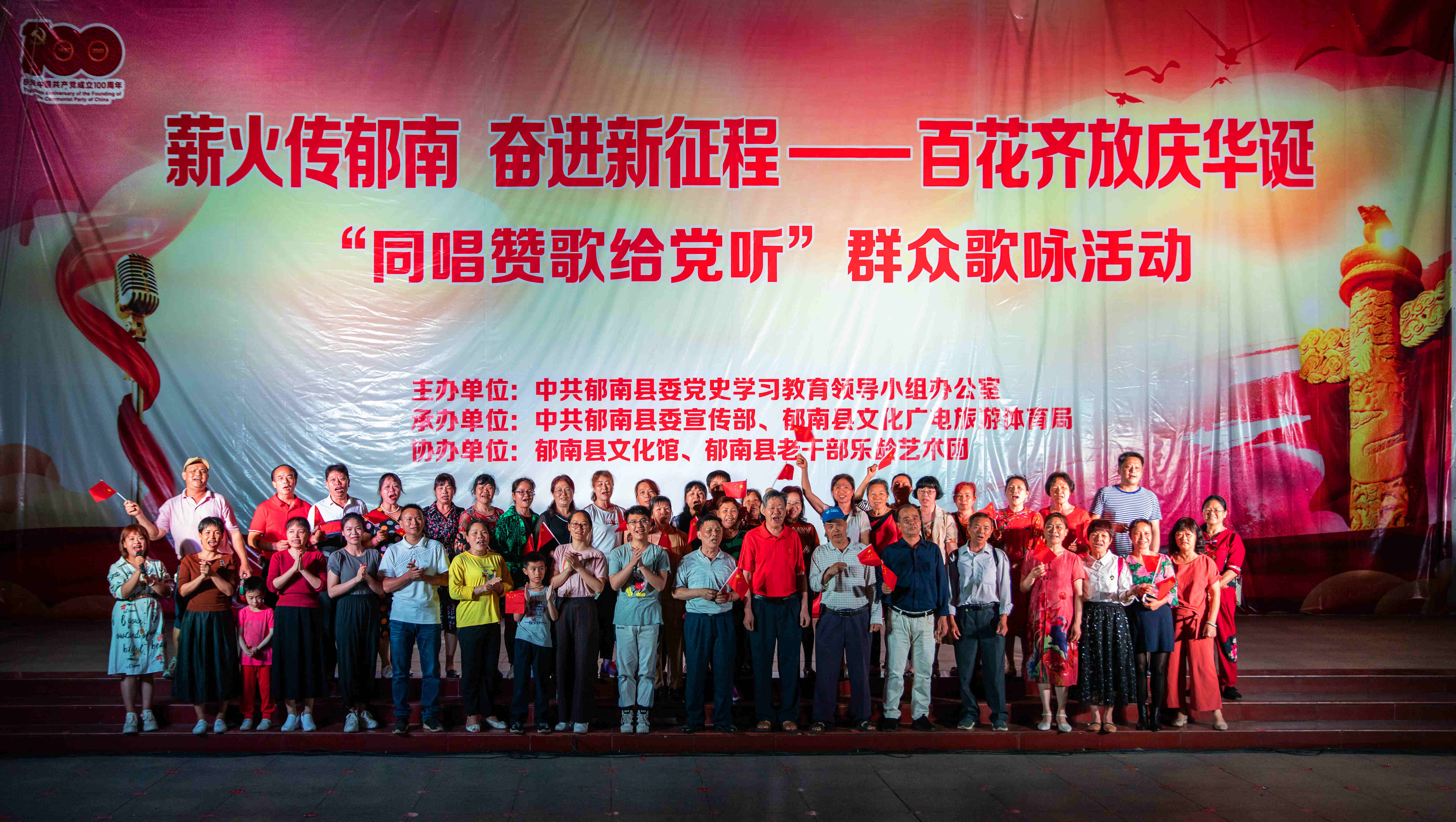 2021年是中國(guó)共產(chǎn)黨成立一百周年,為回首一百年來(lái)我黨走過(guò)的輝煌征程,展現(xiàn)郁南人民愛(ài)黨、愛(ài)國(guó),薪火相傳,努力奮進(jìn)新征程的精神面貌,4月12日晚,由中共郁南縣委黨史學(xué)習(xí)教育領(lǐng)導(dǎo)小組辦公室主辦、中共郁南縣委宣傳部、郁南縣文廣旅體局承辦、郁南縣文化館、郁南縣老干部樂(lè)齡藝術(shù)團(tuán)協(xié)辦的“薪火傳郁南 奮進(jìn)新征程——百花齊放慶華誕‘唱支山歌給黨聽(tīng)’群眾歌詠活動(dòng)周”首晚“同唱贊歌給黨聽(tīng)”群眾歌詠活動(dòng)在縣城文化廣場(chǎng)拉開(kāi)帷幕。