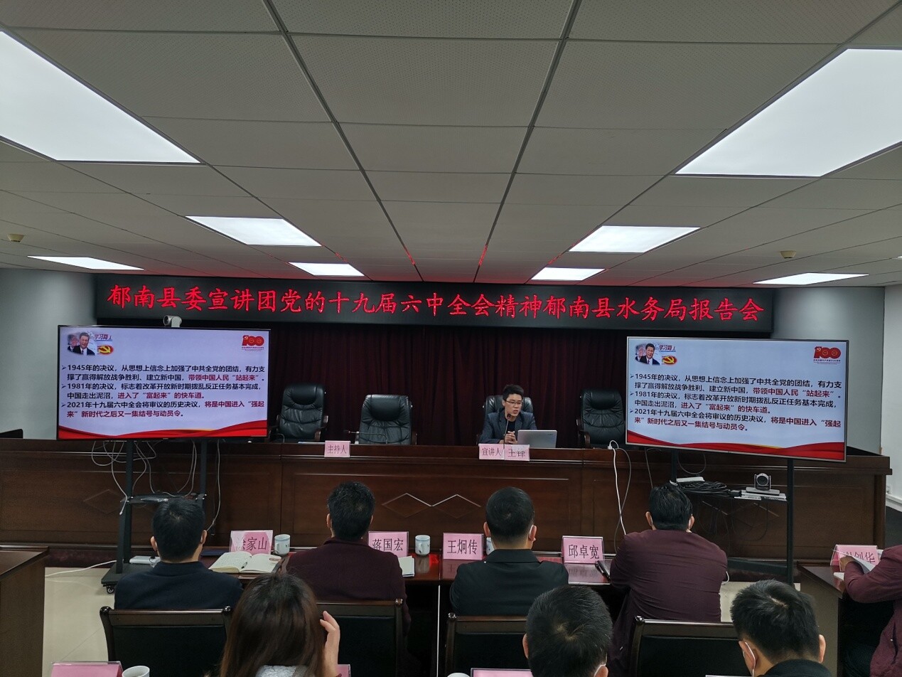 為全面深入學習領會黨的十九屆六中全會精神,扎實推進全系統(tǒng)學習宣傳貫徹工作,融合推動黨史學習教育走深走實,12月19日,縣水務局邀請縣委宣講團成員、西江中學教師王鋒同志作黨的十九屆六中全會專題輔導報告會。局領導班子全體成員、下屬單位負責人和全體黨員干部職工參加了會議。
