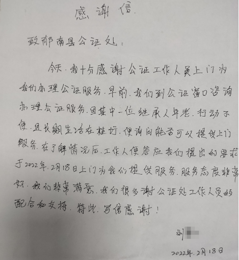 劉女士對上門服務(wù)十分感謝,非常滿意,特意留下一封感謝信致謝??h司法局相關(guān)負(fù)責(zé)人表示,我們不僅要以此作為鼓勵(lì),更要不斷鞭策自身提升服務(wù),將秉承“以人民為中心”服務(wù)理念,持續(xù)履行“十條便民措施”,為人民群眾排憂解難,讓公證服務(wù)溫暖人心。