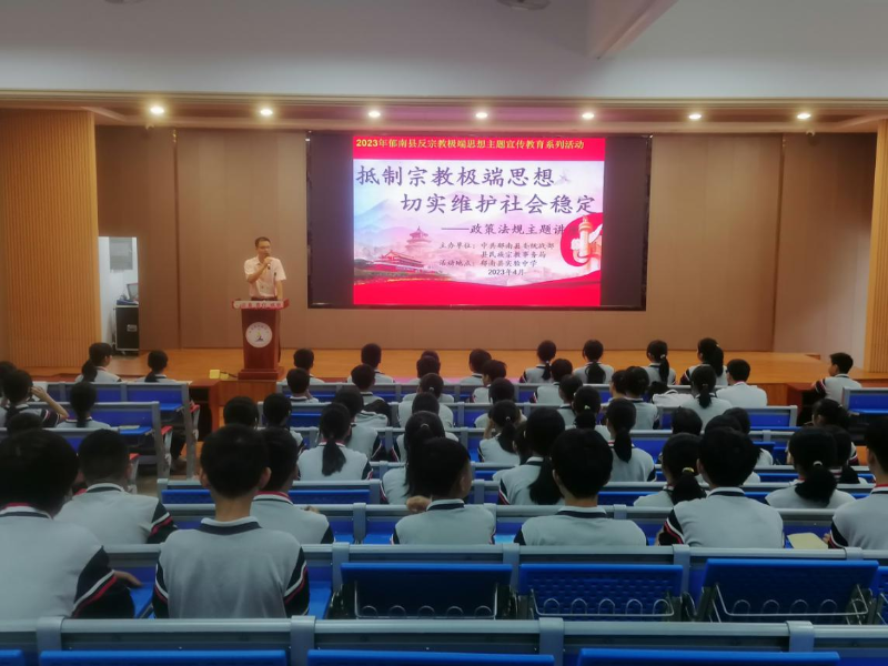 為進一步提高師生樹立正確的國家觀、民族觀、宗教觀,積極營造校園反宗教極端思想宣傳教育氛圍,4月23日下午,縣委統(tǒng)戰(zhàn)部、縣民族宗教事務局聯(lián)合縣實驗中學開展反宗教極端思想進校園活動。