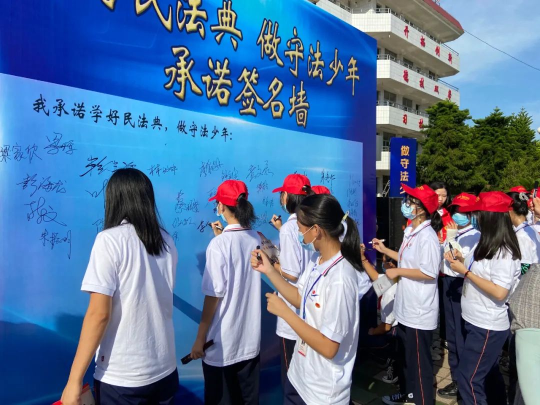 隨后,參會領導向縣職業(yè)技術學校贈送了《民法典》,與會人員共同在“學好民法典 做守法少年”簽名墻上簽名留念,并在文化長廊參觀了民法典宣傳展板。