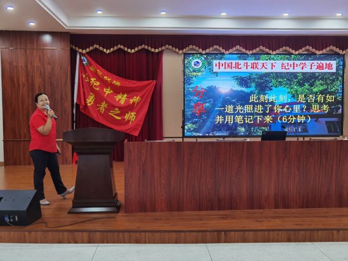 最后,彭燕飛副校長以“中國北斗聯(lián)天下 紀(jì)中學(xué)子遍地花”為主題,對莘莘學(xué)子寄予厚望:她從“6月23日,我國北斗三號全球衛(wèi)星導(dǎo)航系統(tǒng)最后一顆組網(wǎng)衛(wèi)星在西昌衛(wèi)星發(fā)射中心點火升空,標(biāo)志著我國提前半年完成北斗全球衛(wèi)星導(dǎo)航系統(tǒng)星座部署”這一影響我國巨大的時事新聞,展現(xiàn)我國的北斗導(dǎo)航系統(tǒng)從遙不可及到自主在握,濃縮著中國科創(chuàng)新的不凡之路,寫照著中國人向著星辰大海進發(fā)的不屈志氣。以此正能量激勵莘莘學(xué)子:一是志之所趨,無遠弗屆,窮山距海,不能限也;二是山再高,往上攀,總能登頂;路再長,走下去,定能到達;三是“世上無難事,只要肯登攀”!她要求青年學(xué)子要大力發(fā)揚“自主創(chuàng)新、團結(jié)協(xié)作、攻堅克難、追求卓越”的北斗精神,在實現(xiàn)中華民族偉大復(fù)興中國夢的新長征路上不斷前行,努力創(chuàng)造無愧于時代、無愧于人民的新業(yè)績。