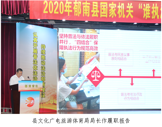 縣公安局、縣人力資源和社會(huì)保障局、縣農(nóng)業(yè)農(nóng)村局、縣文化廣電旅游體育局、縣衛(wèi)生健康局共5個(gè)被評(píng)議單位利用PPT、視頻等材料,將本單位開展普法工作的情況、經(jīng)驗(yàn)和做法,生動(dòng)形象地向大家介紹和展示出來。
