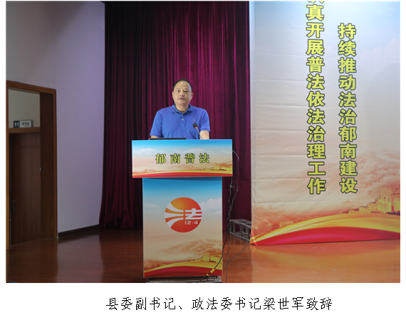 縣委副書記、政法委書記梁世軍致辭,他要求全縣各鎮(zhèn)、各部門要始終堅(jiān)持以習(xí)近平新時(shí)代中國特色社會(huì)主義思想為指導(dǎo),把法治宣傳教育工作作為事關(guān)全縣社會(huì)穩(wěn)定、經(jīng)濟(jì)發(fā)展的一把手工程來抓。要突出重點(diǎn),全面推進(jìn)《民法典》學(xué)習(xí)宣傳和貫徹實(shí)施。廣泛開展《民法典》普法、解讀、宣傳、教育,讓《民法典》走到群眾身邊、走進(jìn)群眾心里,特別是各級(jí)領(lǐng)導(dǎo)干部要做學(xué)習(xí)、宣傳、遵守和維護(hù)《民法典》的表率,切實(shí)提高運(yùn)用《民法典》維護(hù)人民權(quán)益、化解矛盾糾紛、促進(jìn)社會(huì)和諧穩(wěn)定的能力和水平。