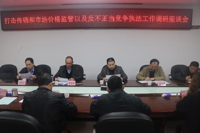 調(diào)研組隨后到達(dá)郁南縣市場(chǎng)監(jiān)管局開展座談,聽取了該局在疫情防控、打傳規(guī)直、價(jià)格監(jiān)督檢查及反不正當(dāng)競(jìng)爭(zhēng)執(zhí)法方面工作情況的匯報(bào),并就相關(guān)問題與該局進(jìn)行了討論交流。徐功華在會(huì)上強(qiáng)調(diào):一是疫情防控仍是當(dāng)下第一要?jiǎng)?wù),各項(xiàng)工作在抓好防控工作前提下開展;二是要準(zhǔn)確把握新政策方向和執(zhí)法重點(diǎn),進(jìn)一步加強(qiáng)市場(chǎng)監(jiān)管執(zhí)法,爭(zhēng)取在反不正當(dāng)競(jìng)爭(zhēng)執(zhí)法等領(lǐng)域取得突破;三是要提前謀劃,壓實(shí)工作任務(wù),規(guī)范執(zhí)法程序,保證執(zhí)法案件數(shù)量和質(zhì)量雙提升。