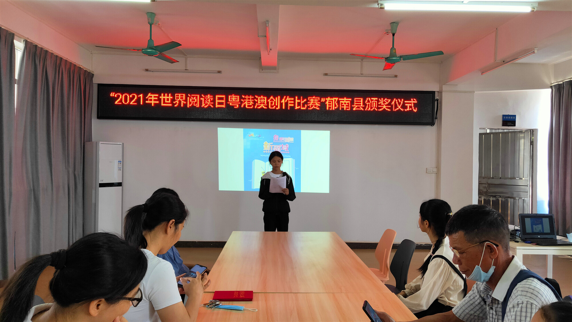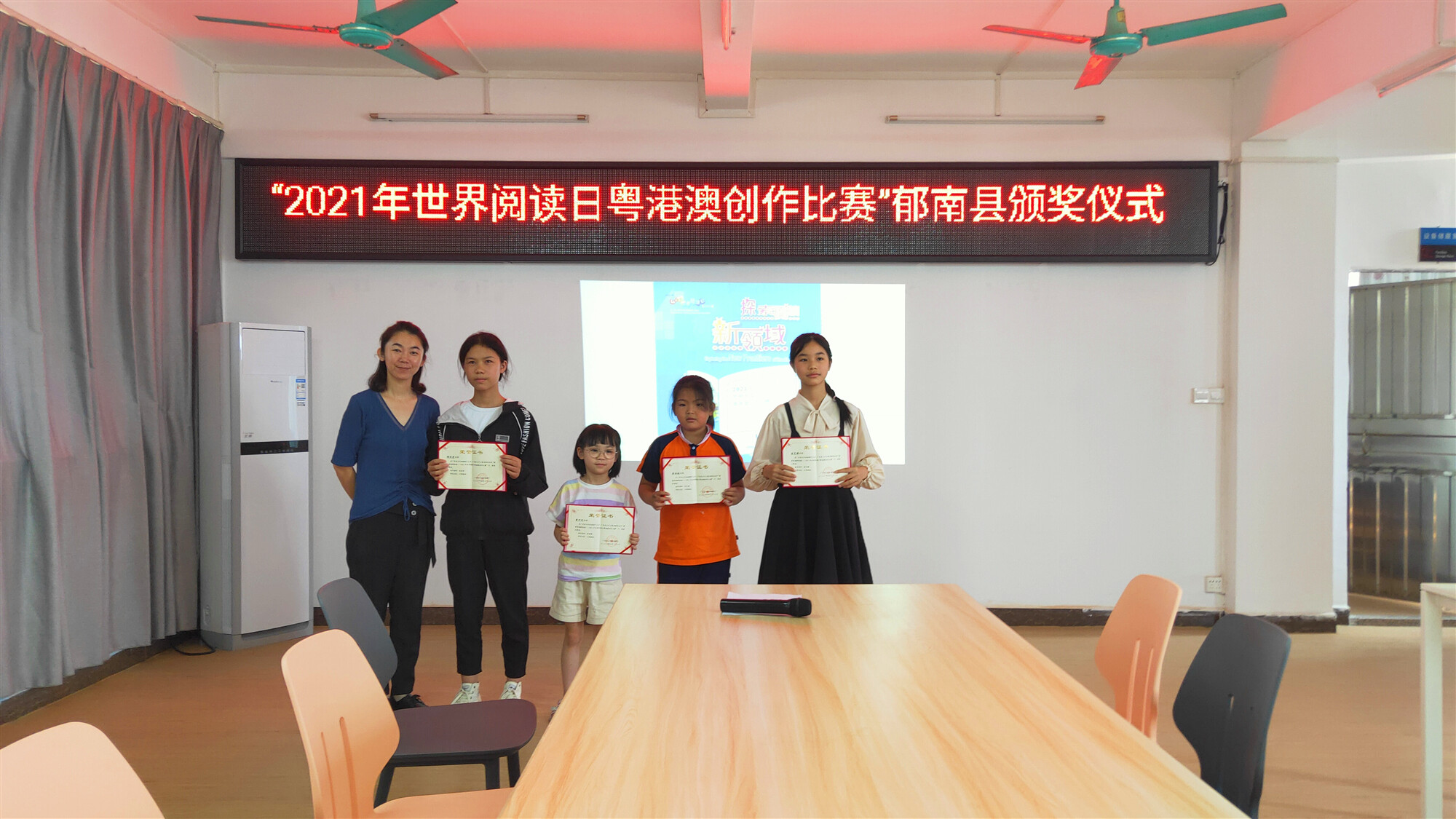 為鼓勵(lì)兒童及青少年拓展閱讀領(lǐng)域,深化閱讀層次,用閱讀開啟知識(shí)大門,粵港澳三地聯(lián)合了舉辦以“探索閱讀新領(lǐng)域”為主題的2021年世界閱讀日粵港澳創(chuàng)作比賽。郁南縣圖書館總分館通過微信公眾號(hào),以線上活動(dòng)形式面向全縣中小學(xué)開展“2021世界閱讀日粵港澳創(chuàng)作比賽”作品征集活動(dòng),得到縣內(nèi)各中小學(xué)校老師、家長、學(xué)生們的積極響應(yīng),踴躍參與。本次活動(dòng)廣東賽區(qū)共收到創(chuàng)作稿件9.8萬份,郁南縣圖書館選送作品38份,其中4份作品獲省級(jí)榮譽(yù),分別為初中組一等獎(jiǎng)一名、高小組三等獎(jiǎng)一名、初小組優(yōu)秀獎(jiǎng)兩名,由廣東省文化和旅游廳頒發(fā)獎(jiǎng)狀。2021年4月24日上午,郁南縣圖書館在四樓舉行了頒獎(jiǎng)儀式。頒獎(jiǎng)儀式上,獲獎(jiǎng)?wù)呦騾⒓踊顒?dòng)的讀者分享了獲獎(jiǎng)心得。