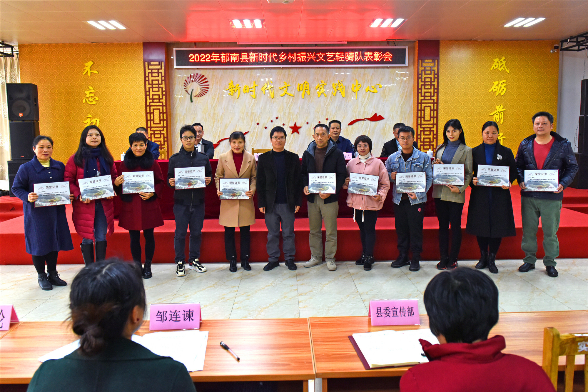 隨后,與會領導分別為榮獲2020年度云浮市群眾文藝創(chuàng)作以及為云浮市文藝創(chuàng)作生產重點選題項目《南江人家》作出積極貢獻獎、郁南縣新時代鄉(xiāng)村振興文藝輕騎隊突出貢獻獎、精神建設獎、貢獻獎的20多名獲獎人員分別頒發(fā)了證書,勉勵其凝心聚力、戒驕戒躁、砥礪前行,為郁南文化事業(yè)繁榮發(fā)展再立新功。