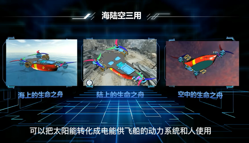 該作品創(chuàng)作背景是當(dāng)人類(lèi)面臨各種災(zāi)害時(shí),通過(guò)海陸空一體三用的“生命之舟”展開(kāi)救援,為減少事故和自然災(zāi)害帶來(lái)的損失提供了一種新的可能。