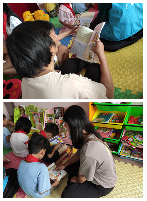 小朋友們在書架上選取了自己感興趣的繪本,通過分享董存瑞、狼牙山五壯士、劉胡蘭等革命先輩的紅色故事,相互交流讀書經驗。志愿者們還指導家長們如何講述繪本、吸引孩子們的注意力;同時鼓勵孩子們模仿故事情節(jié)的,做出故事內容的表情和動作,激發(fā)孩子的想象力。