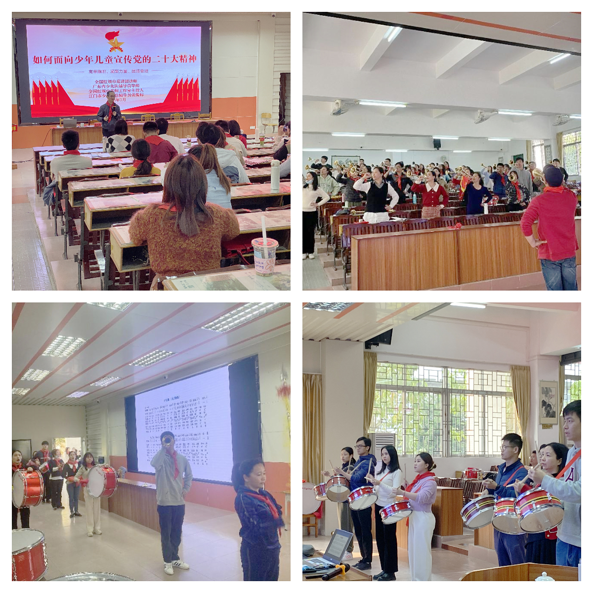 本次培訓(xùn)活動(dòng)邀請(qǐng)廣東省少先隊(duì)鼓號(hào)教練員,廣東省少隊(duì)輔導(dǎo)員初級(jí)導(dǎo)師,廣東省紅領(lǐng)巾巡講團(tuán)成員高家新老師和張俊標(biāo)老師授課,主要采用“理論+實(shí)踐”的方式,培訓(xùn)內(nèi)容包括少先隊(duì)基礎(chǔ)業(yè)務(wù)知識(shí)和鼓號(hào)隊(duì)的演奏方法、樂理知識(shí)、規(guī)范動(dòng)作等。各學(xué)員們認(rèn)真細(xì)致、全神貫注,積極地投入到緊張的訓(xùn)練中。