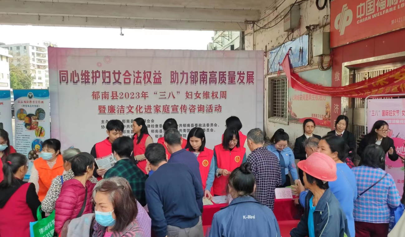 為引導(dǎo)廣大婦女及家庭學(xué)法遵法守法用法,依法維護(hù)自身合法權(quán)益,在全社會營造男女平等、和諧共進(jìn)的良好氛圍,3月8日上午,縣婦聯(lián)聯(lián)合縣紀(jì)委監(jiān)委、縣委政法委、縣司法局、縣總工會、團(tuán)縣委、縣法院、縣檢察院等相關(guān)單位在縣城文化廣場,舉辦“同心維護(hù)婦女合法權(quán)益 助力郁南縣高質(zhì)量發(fā)展”郁南縣2023年“三八”婦女維權(quán)周暨廉潔文化進(jìn)家庭宣傳咨詢活動和開展婦女維權(quán)熱線12338主席接聽日活動。