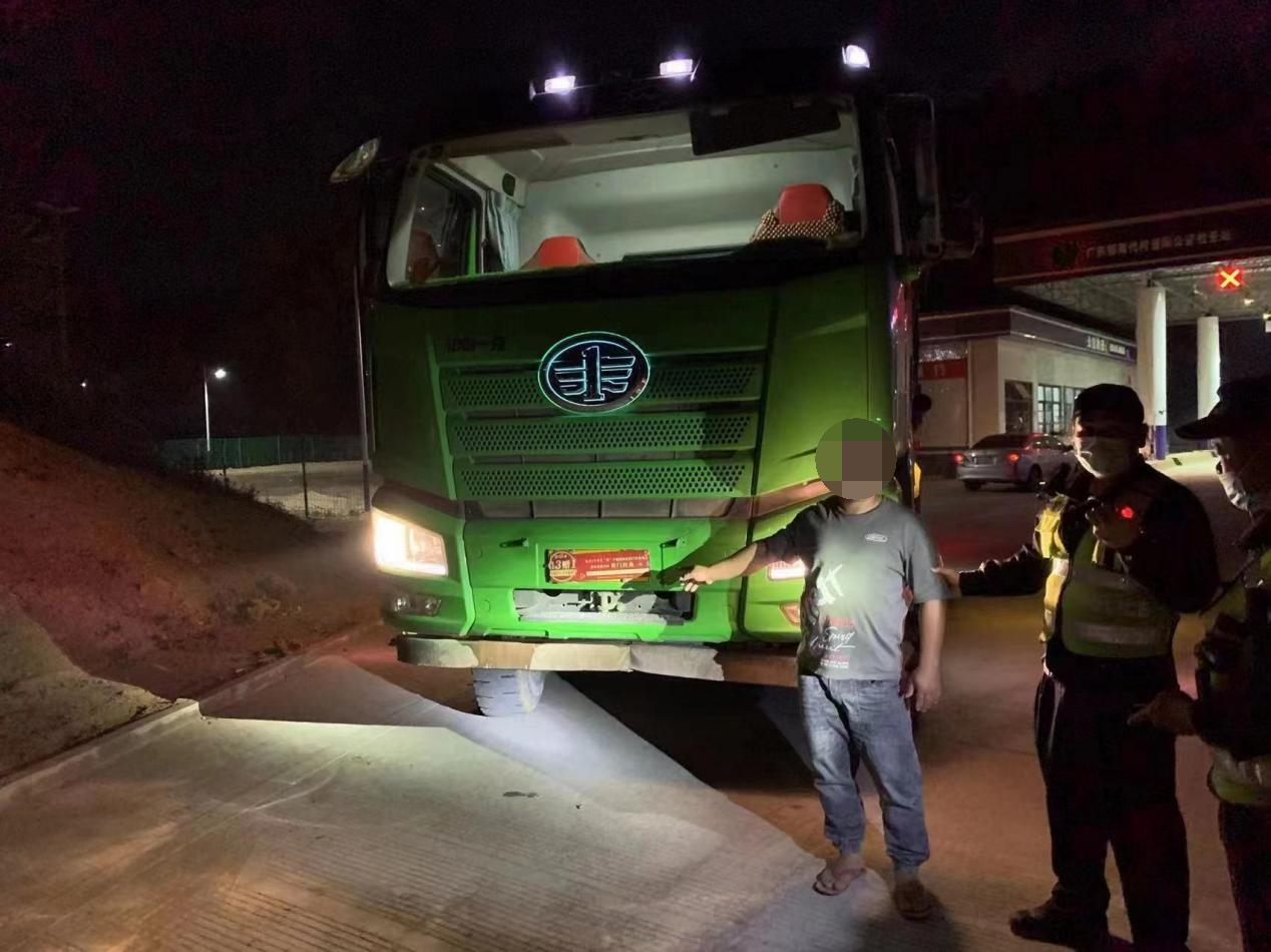 執(zhí)法人員利用夜間執(zhí)法在現(xiàn)場查處一輛遮擋車牌號碼的貨車