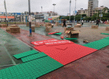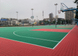 ▲體育中心籃球場地面塑膠鋪設(shè)工作