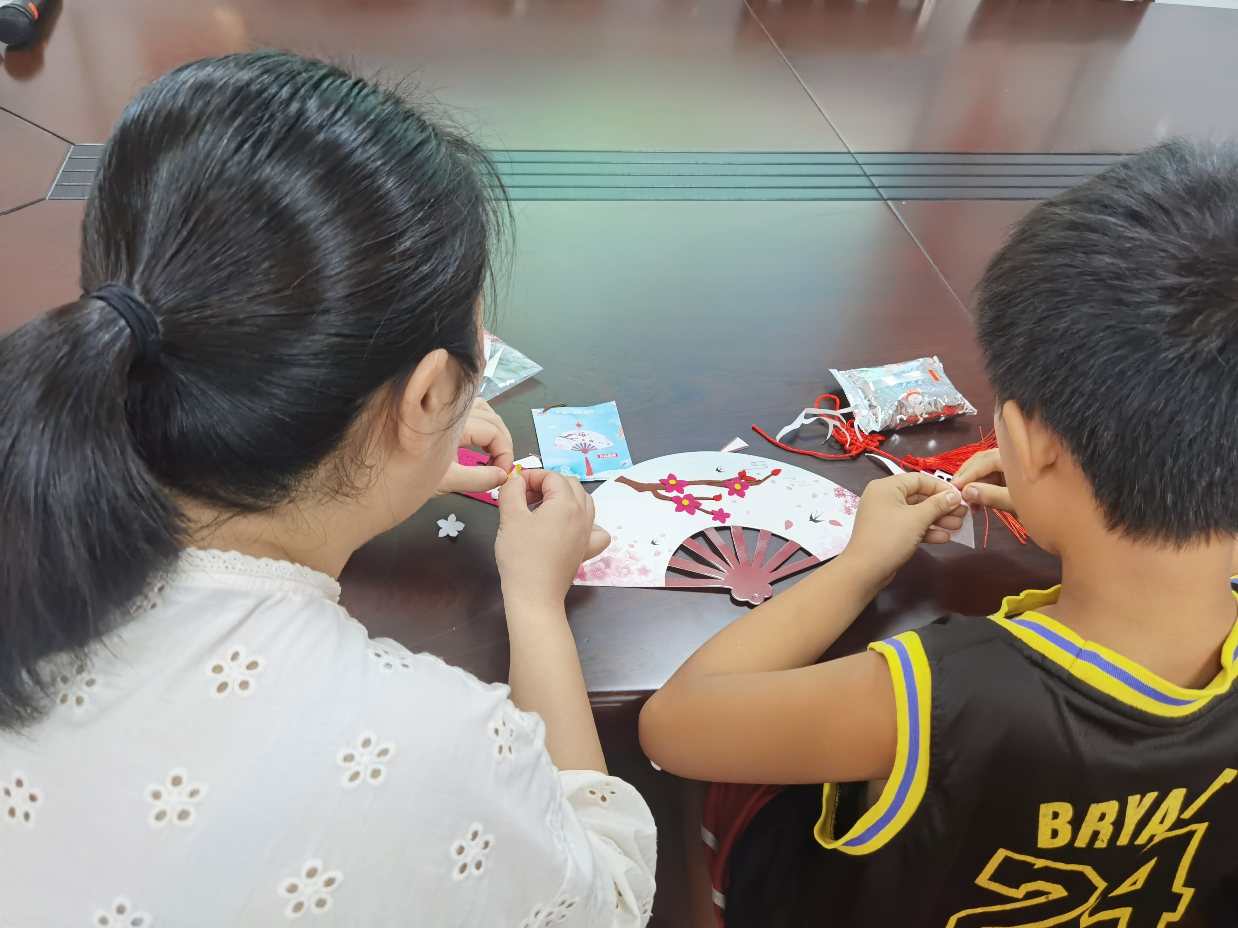 接下來就是孩子們期待的制作手工扇子環(huán)節(jié),年齡小的在家長們的協(xié)助下,認(rèn)真粘貼圖案,一絲不茍地對待每一個(gè)環(huán)節(jié)。經(jīng)過半小時(shí)的創(chuàng)作,一把把空白的扇子在孩子們的手中變得色彩斑斕,孩子們喜悅之情溢于言表。活動現(xiàn)場氣氛熱烈,大家追溯著七夕之源,感受著中華優(yōu)秀傳統(tǒng)文化之美,享受著動手制作之樂。