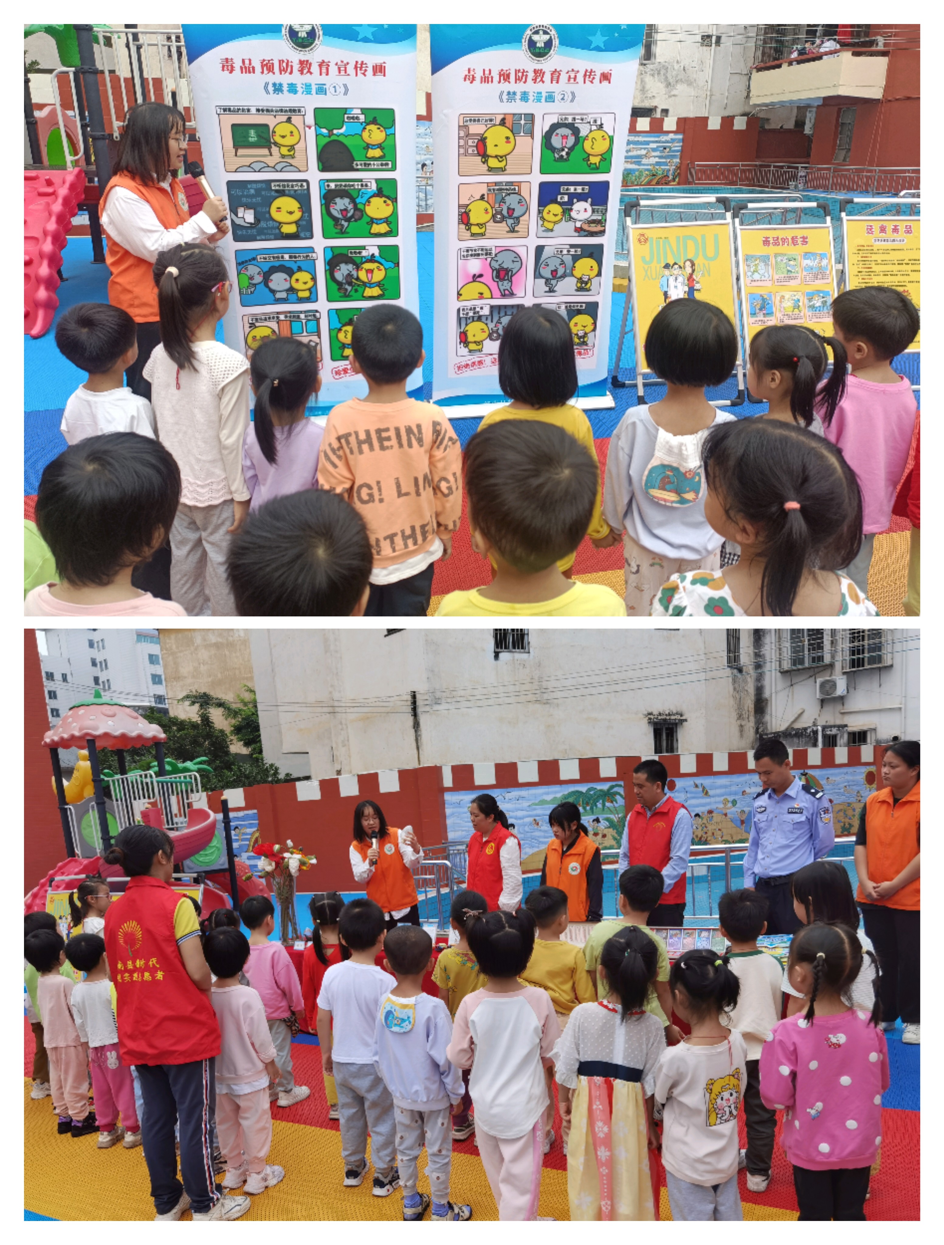 針對(duì)幼兒園兒童年紀(jì)小、理解能力有限的特點(diǎn),巾幗禁毒志愿者采用簡(jiǎn)潔明了的PPT形式,通過(guò)生動(dòng)有趣的圖片、故事,講解了毒品的形狀特點(diǎn)、吸毒的危害以及怎樣拒絕毒品,教育小朋友們要珍愛(ài)生命,遠(yuǎn)離毒品,不要隨意接受陌生人的飲料和食品。禁毒小課堂結(jié)束后巾幗志愿者組織小朋友們參觀了禁毒宣傳海報(bào)和仿真毒品模型,參與“禁毒套圈圈”和“甩毒蛋”等互動(dòng)游戲。通過(guò)宣傳教育和游戲互動(dòng),讓參與的孩子們以寓教于樂(lè)、寓學(xué)于趣的形式認(rèn)識(shí)到毒品的危害,增強(qiáng)對(duì)毒品的防范意識(shí)和自我保護(hù)能力。