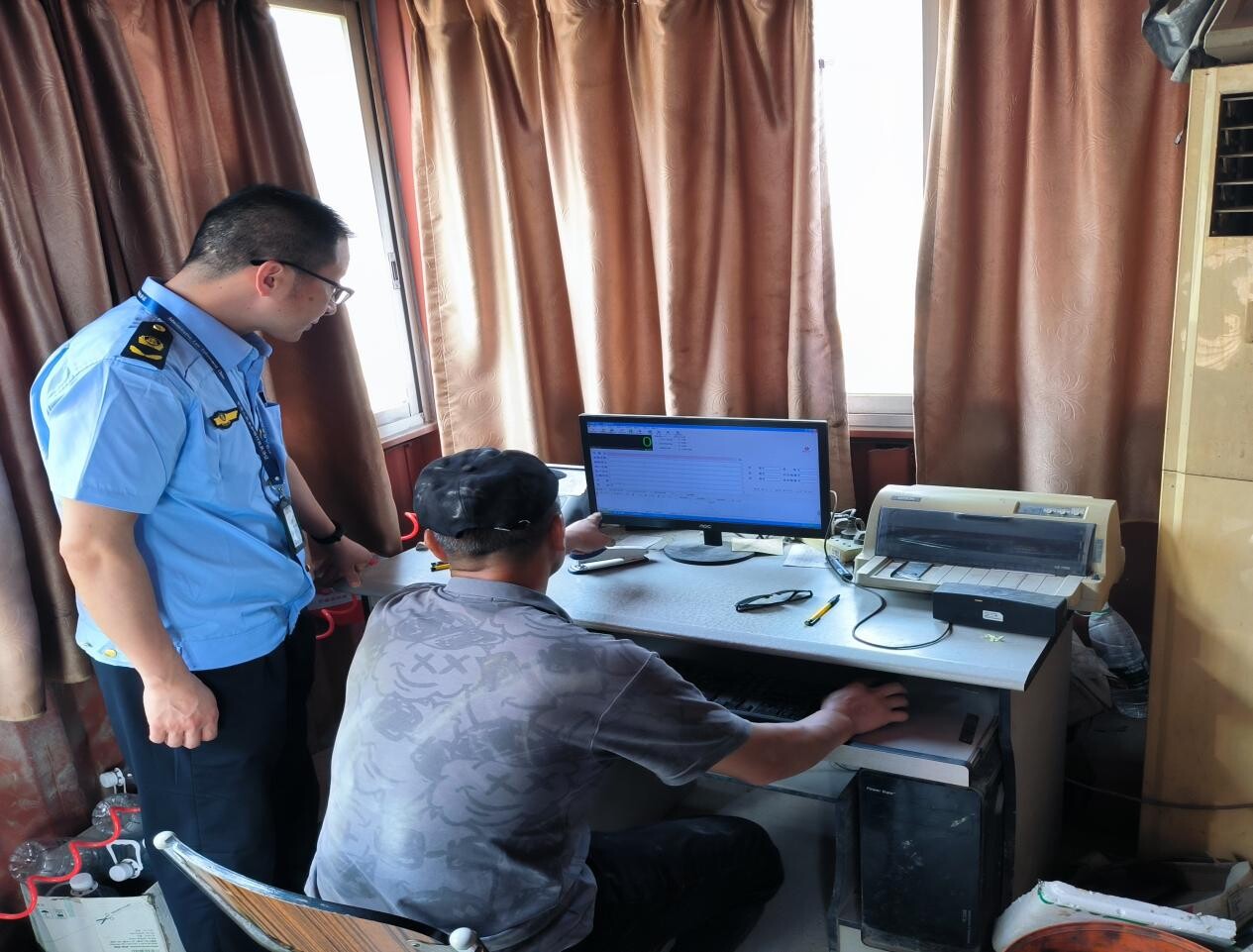 執(zhí)法人員檢查貨車出場(chǎng)稱重檢測(cè)記錄