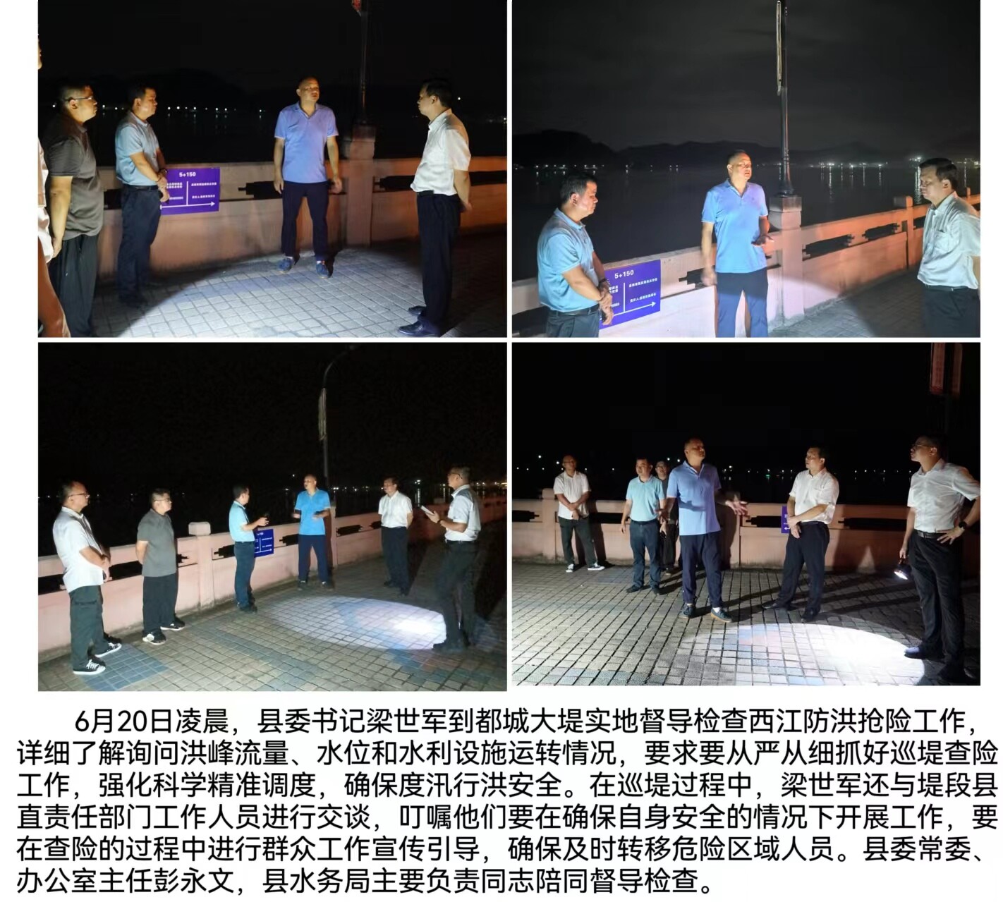 “盯”責(zé)任。對(duì)西江沿岸的堤圍、水閘、電排站等水利工程進(jìn)行防洪安全檢查,壓實(shí)層級(jí)行政、技術(shù)等相關(guān)責(zé)任人的防汛崗位責(zé)任,強(qiáng)化沿西江水利工程安全運(yùn)行管理的指導(dǎo)督導(dǎo),確保防御措施、應(yīng)急人員、防汛物資“三到位”。6月20日凌晨,西江水位達(dá)19.15米,由縣城各責(zé)任單位組成的巡查隊(duì)伍聞令而動(dòng),迅速集結(jié)西江大堤,縣主要領(lǐng)導(dǎo)實(shí)地指導(dǎo)開(kāi)展巡堤工作。