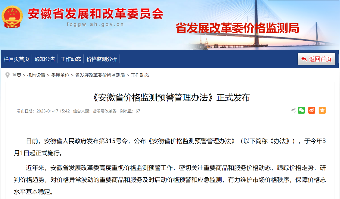 《安徽省價(jià)格監(jiān)測(cè)預(yù)警管理辦法》。圖片來(lái)源:安徽省發(fā)展和改革委員會(huì)