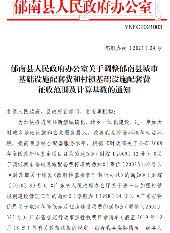 (YNFG2021003)郁南縣人民政府辦公室關(guān)于調(diào)整郁南縣城市基礎(chǔ)設(shè)施配套費和村鎮(zhèn)基礎(chǔ)設(shè)施配套費征收范圍及計算基數(shù)的通知(郁府辦函〔2021〕24號)
