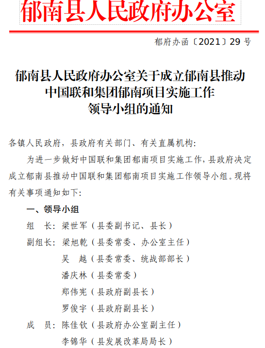 郁南縣人民政府辦公室關(guān)于成立郁南縣推動中國聯(lián)和集團(tuán)郁南項目實施工作領(lǐng)導(dǎo)小組的通知(郁府辦函〔2021〕29號)